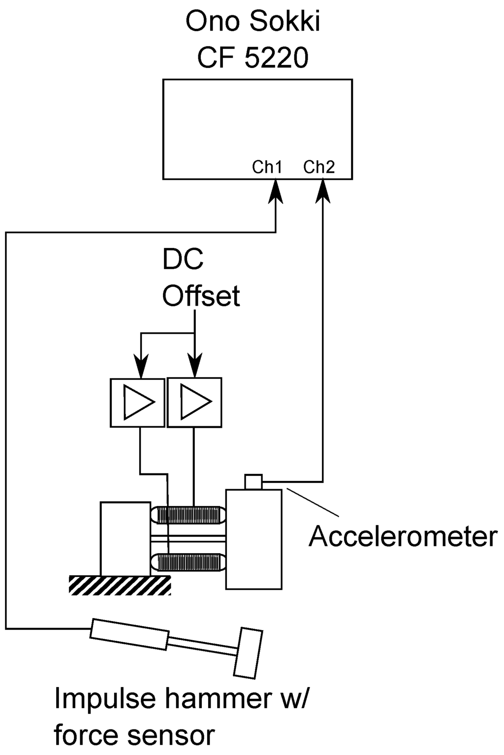 For the evaluation of the generated active force of the device, the piezoelectric actuators were driven with a swept sine signal generated by the analyzer. A simple analogue circuit generates an out of phase driving signal for one of the actuators in order to excite the bending mode of the actuator system, and the acceleration of the tip mass was measured (Figure 11). Since the mounting plate can be assumed not to interact with the active system, the block force can be directly derived from the acceleration and the mass.