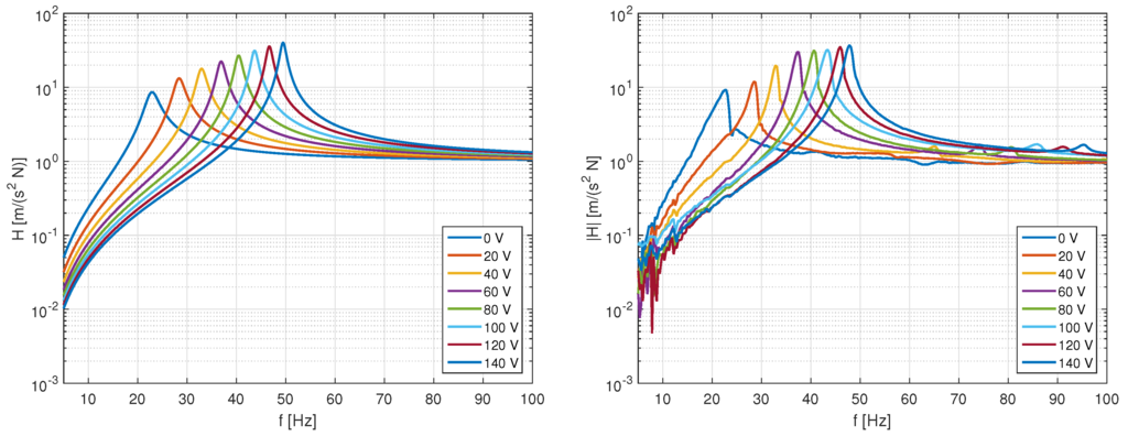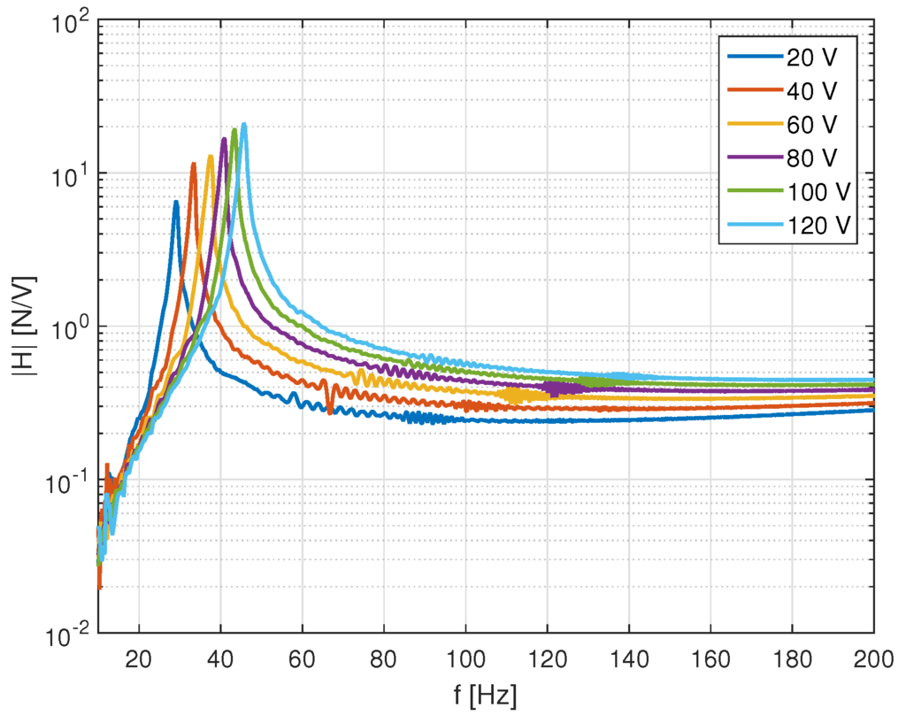 For this test, different pre-loads from 20 to were applied to the actuators. The resulting FRFs between applied driving voltage and the generated force show the expected characteristics (Figure 12). In the frequency range above the first resonance and , no further resonances are excited. However, it was observed that the FRFs are influenced by the pre-load. The block force above the resonance increases slightly with the pre-loading voltage. This might be caused by a non-linearity in the piezoelectric elements, i.e., a dependency of the piezoelectric constant to the pre-load.