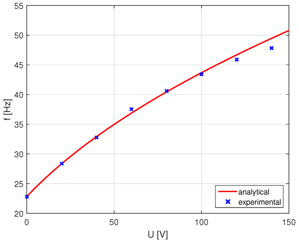 Applying a static voltage to both actuators, a tensile (normal) force is induced at the beam, which is responsible for additional beam stiffness. In general, this effect can be described by the differential equation for the axially-loaded Euler-Bernoulli beam (4).