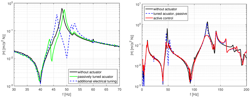In the first step, the adaptive absorber was tuned by mechanical pre-load to a structural mode, which resulted in a vibration absorption effect at (Figure 14, left). This effect was enhanced by choosing an additional electrical pre-load of , which resulted in an absorption frequency of . Although this frequency does not match the structural resonance at exactly, this configuration served well as a basis for adjusting the active control system.