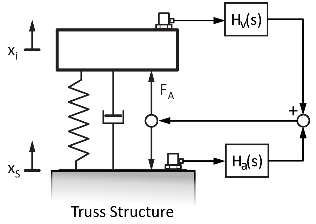 To evaluate the performance in an active vibration control system, the adaptive absorber was mounted to a lightweight truss structure (Figure 13). It was instrumented with accelerometers at its base and at the inertial mass.