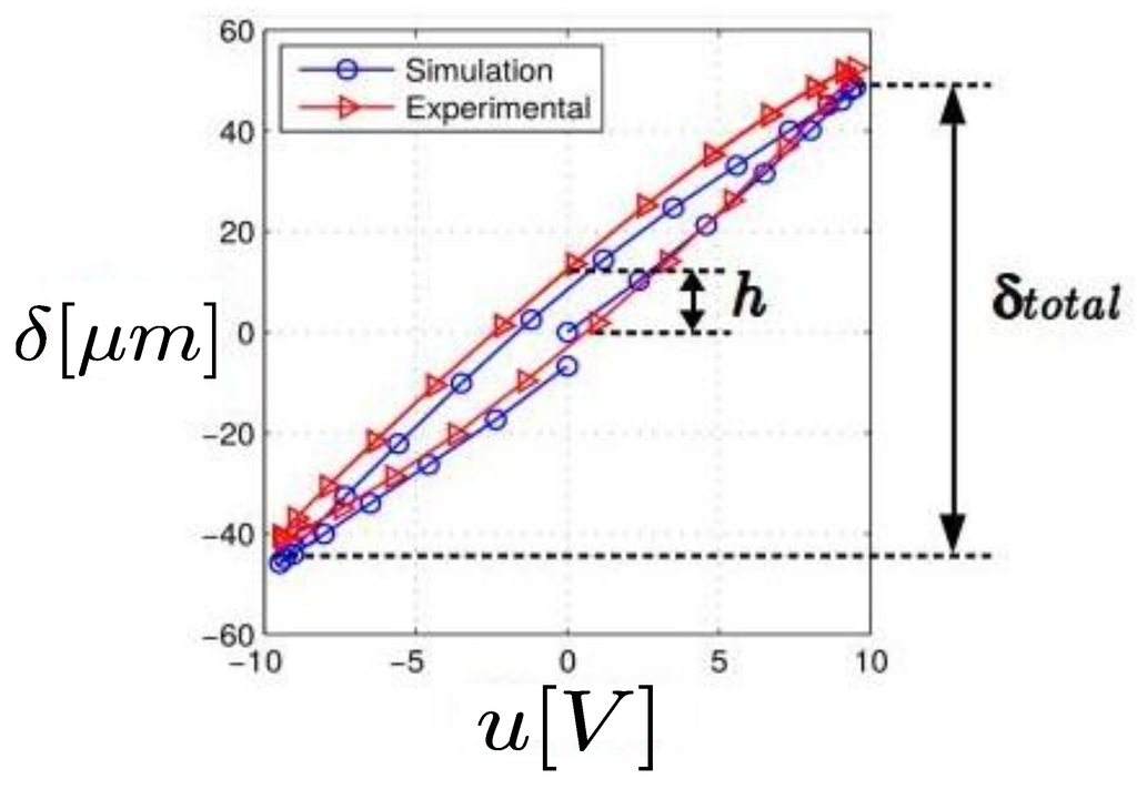 Figure 2 depicts the hysteresis behavior between the input voltage and the output displacement of a PEA when the input is a sinusoid of amplitude 10 V at a 0.1 Hz frequency. In this example, the hysteresis amplitude is of .