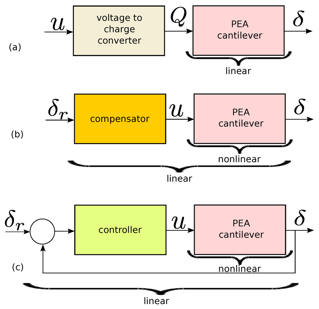 Feedback control ensures robustness and reject of eventual external disturbances by maintaining certain tracking performances (Figure 3c). However, in some applications like micro-robotics, feedback control is not always applicable because of the lack of convenient sensors to perform measurements. Many techniques have been developed to feedback control PEA based on cantilever structures, for instance: simple tuning based techniques [37,38,39], based robust techniques [8,11,29,40,41,42], interval based robust techniques [43,44,45], adaptive, sliding and iterative techniques [26,46,47,48,49,50,51].