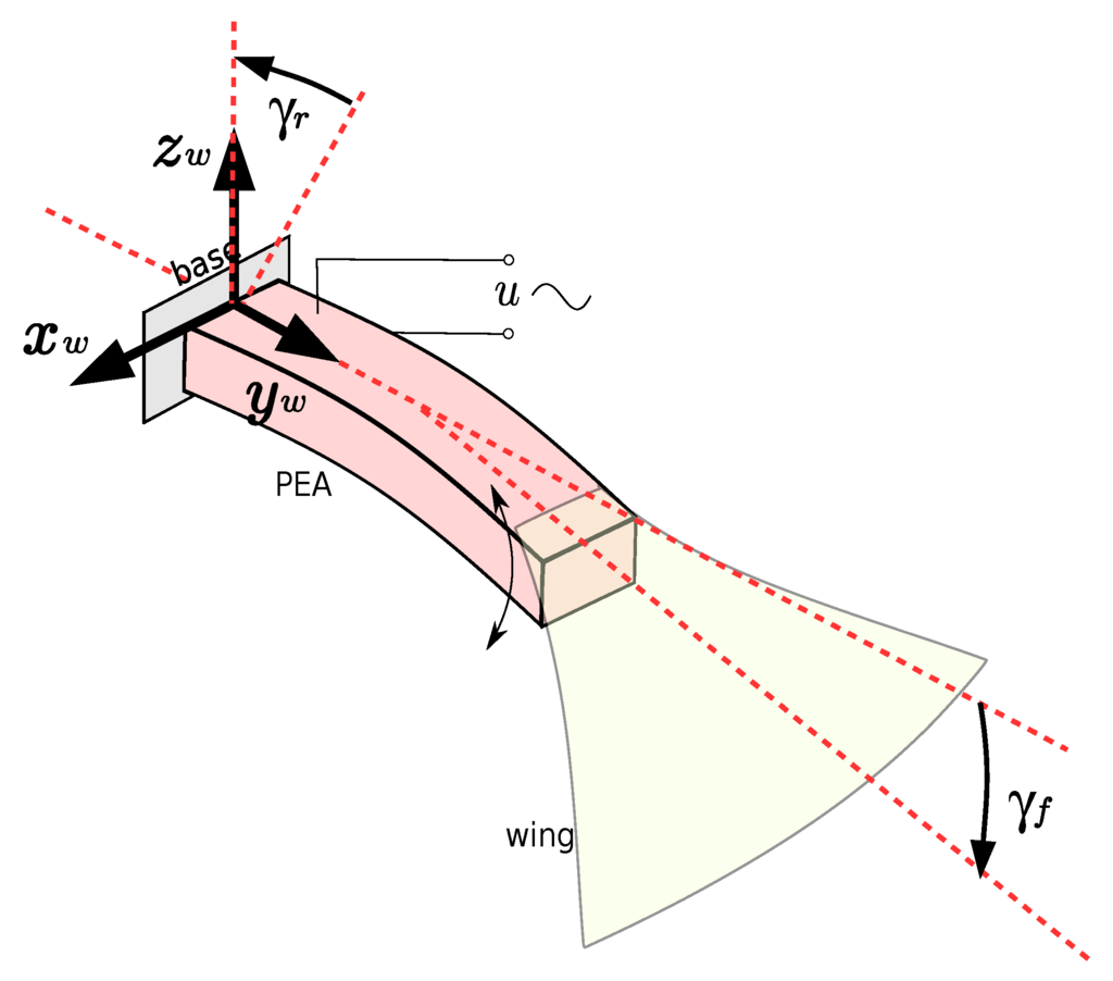 If the PEA is used to actuate an additional wing, the mass of the wing can be considered as well. In order to keep this review concise, we will not detail the formulas of , , and the mode coefficient . We encourage the reader to go to [4], where these coefficients are described in detail.