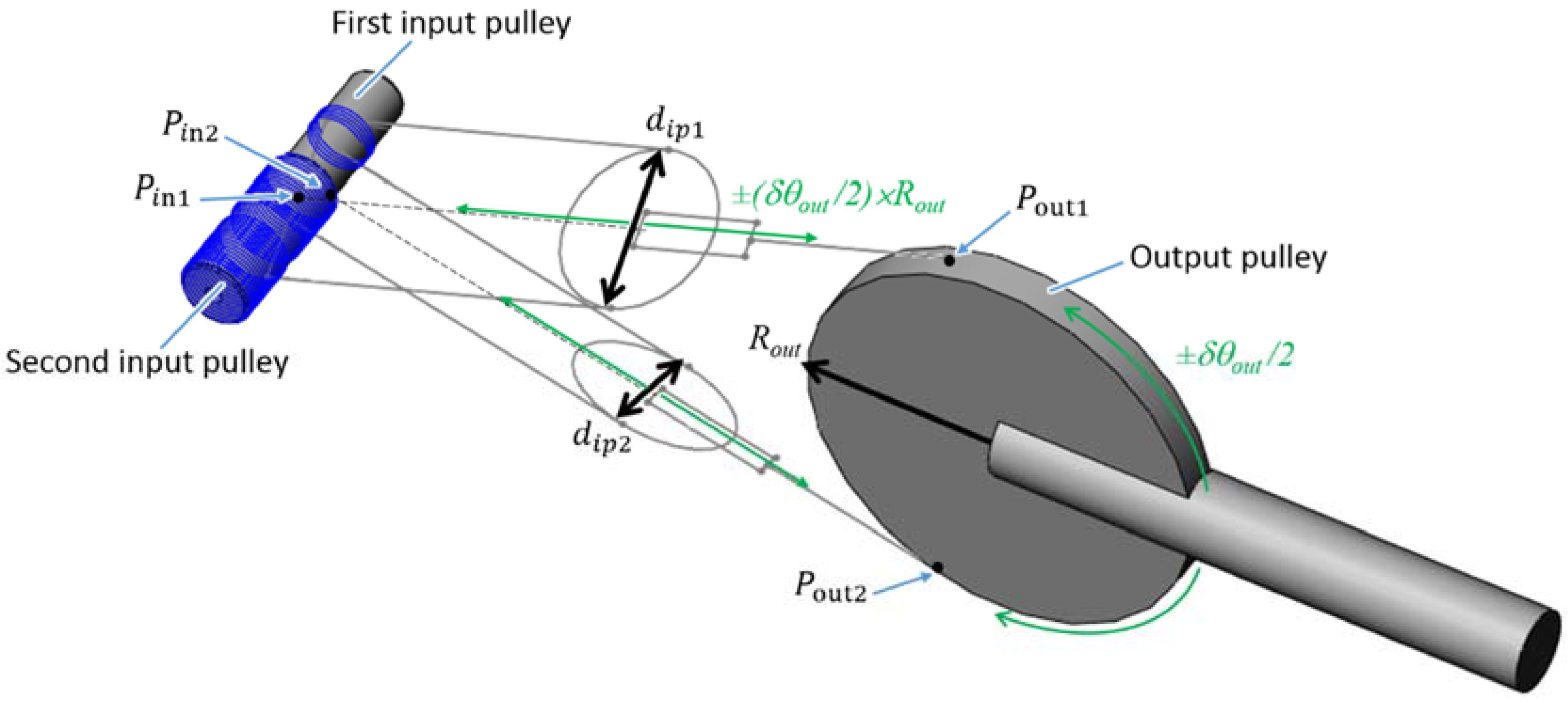 For a joint’s range of motion = 131° and an output pulley’s radius = 50 mm, the translation of the idler pulleys reaches 57 mm in both directions and the input pulleys must be placed = 200 mm behind axis 1. Having a larger input cable would increase both the input pulleys diameter and the thread pitch and, hence, longer and larger pulleys. Larger idler pulleys would also be required, which would span a larger space, hence, in turn a longer distance between the pulleys’ axis and axis 1. Globally, the reducer would be much more bulky.
