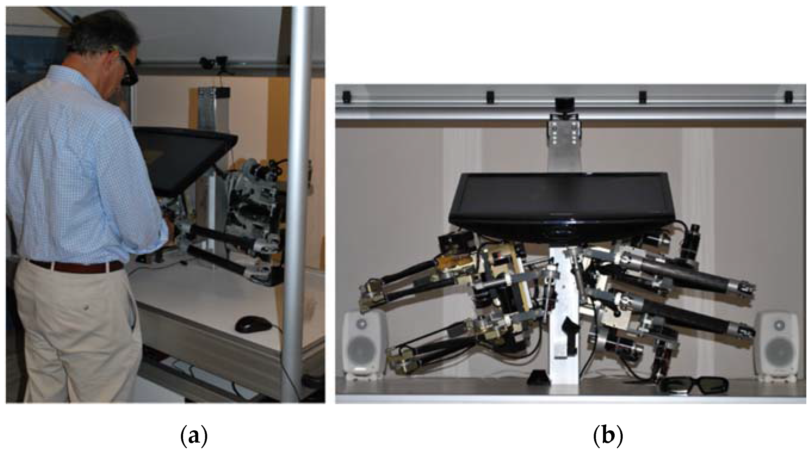 18]. Teleoperation systems are composed of a master arm equipped with a handle grasped in hand and manipulated by an operator, and a slave robot, located in a remote environment, which mimics the movements of the master arm. This way, the user is able to control the movements of the robot in the distant site which he cannot physically access because this site is hazardous (e.g., nuclear teleoperation, space telerobotics), distant, or at a different scale (e.g., telesurgery, tele micromanipulation). In force feedback systems, the master arm is further equipped with motors which are controlled either to follow the slave robot’s movements, or to apply forces similar to those applied on the slave arm and sensed with adequate sensors. This way, the operator is able to feel the interactions of the slave robot with its environment and can work more precisely, more quickly, and with less force, at the price of more complexity and potential instabilities if the gains in the controller of the master slave coupled system are improperly adjusted. The same principle is used in VR haptics, the slave robot being replaced with an avatar in a simulated environment. The user manipulates a haptic interface usually equipped with a handle whose movements are reproduced by a virtual avatar. A physical engine is used to compute, in real-time, the forces applied on the avatar; for example, simulated gravity or forces applied by the surrounding objects if collisions with the environment occur, and its dynamics. Finally, the haptic interface actuators are used to move the handle according to the avatar’s movements or to reproduce the forces applied on it. VR haptics can be used, for example, to simulate assembly tasks and verify that the different parts of a complex system being designed can be assembled together. This approach allows quicker detection of clashes and faster settlement of errors compared to real prototypes. As the human behavior can be simulated as well, VR systems can also be used to design workshops, assembly lines, or dexterous tasks in a complex environment and check their ergonomics.