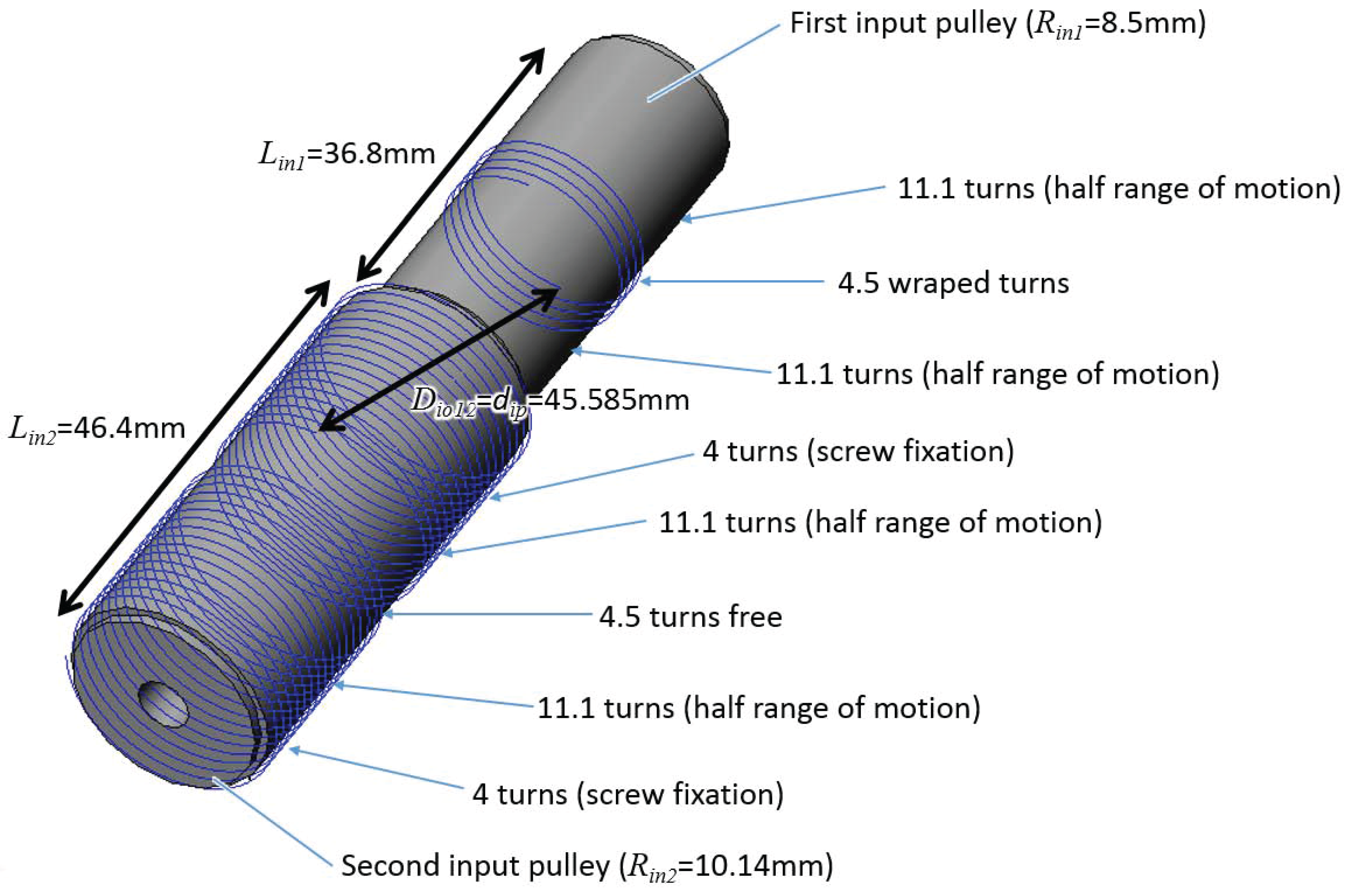 Figure 8 shows additional details on the dimensions of the input pulleys. A first end of the input cable is attached at the first end of the second input pulley using a screw. It is then wound around the pulley, with a sufficient number of turns to allow for half the joint’s range of motion in one sense. Then the cable exits the pulley, is wound around a first reducer idler pulley and enters the first input pulley. It is then wound around the pulley, with a sufficient number of turns to avoid slipping (here 4.5 turns are sufficient). Then it exits the first input pulley, is wound around the second reducer idler pulley, and enters the second input pulley around which it is wound with a sufficient number of turns to allow for half the joint’s range of motion in the other sense. Finally, the second end of the cable is attached to the second input pulley using a screw. It is worth noting that 11.1 turns of cable must be left free on both sides of the cable wound around the first input pulley to allow for the cable to move along this pulley when the joint moves half its range of motion in both senses (the range of motion is 131° here, slightly larger than in the example given in