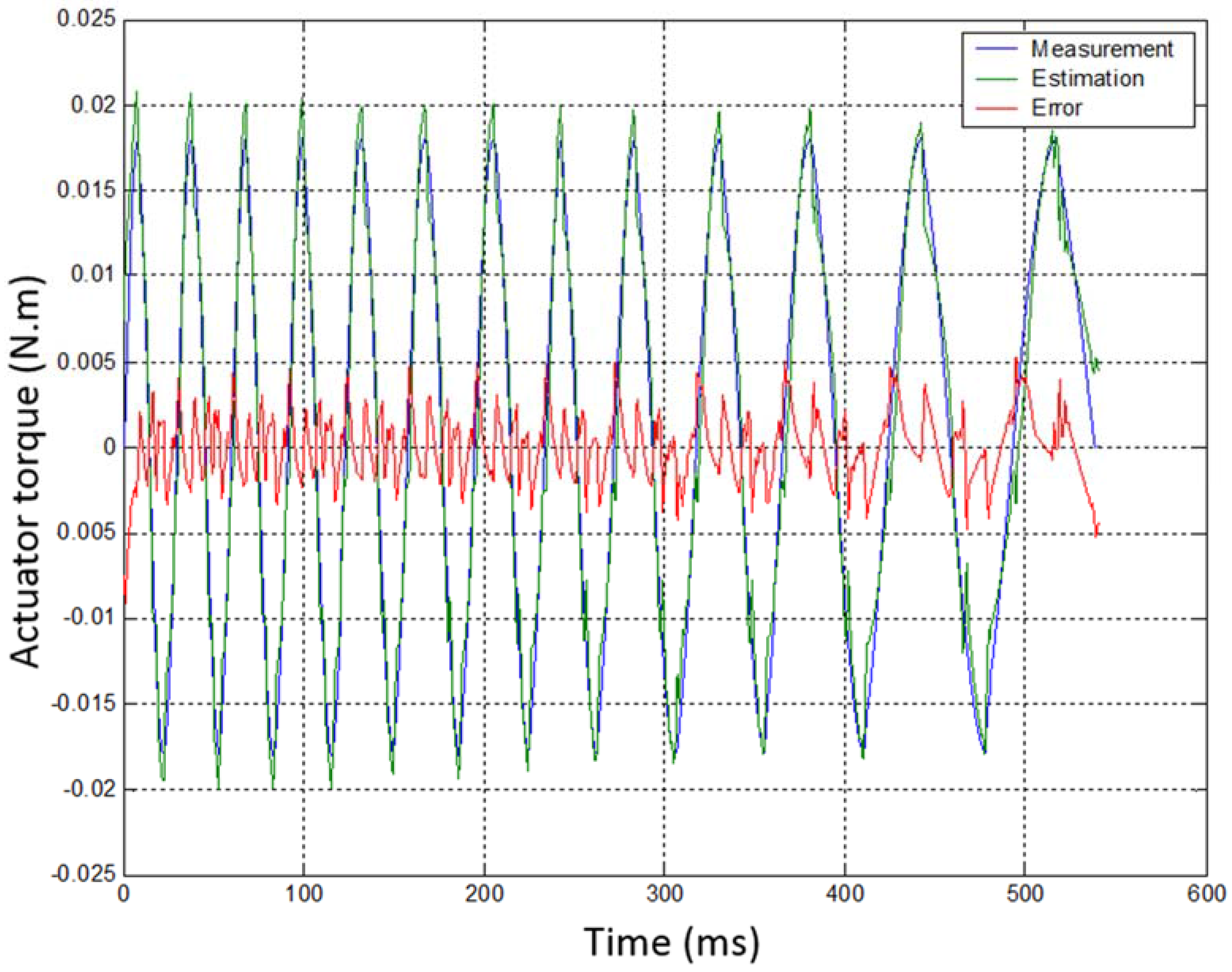 Figure 14, the arm was blocked and sinusoidal movement orders were sent to the motor. The parameters are identified with a linear least-squares approach. The measures of the motor and joint’s encoders and the motor input current are used as inputs to compute the motor inertia