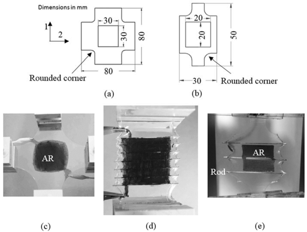 Two experimental assessment phases consisted of: (a) Force Measurement; and (b) Life Assessment. Different DEA configurations were used for each experimental set as shown in Figure 1. In force measurement, the samples were configured to have the total AR area of 30 mm × 30 mm to fit in the bi-axial stretch system shown in Figure 1a,c. The corners near the AR were rounded to avoid stress concentration, hence no mechanical failure for the pre-strain up to 200% in both directions 1 and 2. Subsequently, a RP-DEA with the same configuration was fabricated to compare the force outputs (Figure 1d). In this case, 7 rods were placed with a spacing of 5 mm on the DE film.