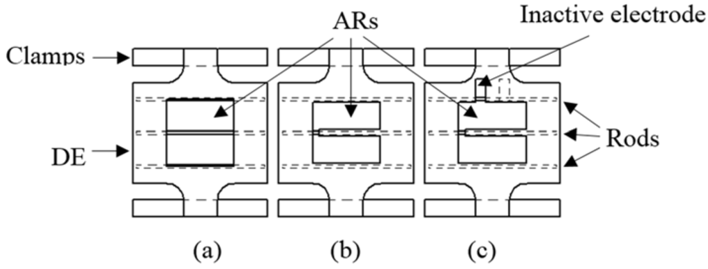 Configured Rod Pre-strained Dielectric Elastomer Actuators (RP-DEAs) in life assessment: (a) single AR; (b) two separate ARs connected via bridge; and (c) two separate ARs with bridge and extended electrode region for connection.