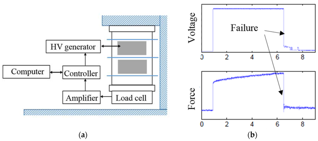 Experimental system: (a) test rig set-up; and (b) failure detection through voltage monitoring and force measurement.