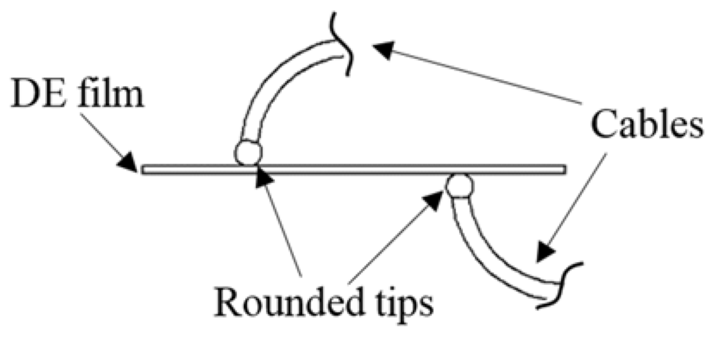 A high voltage (HV) generator was used to amplify the input voltage (0–10 V) from a programmed system. The actual voltage output (0–15 kV) from the generator was monitored and fed back to detect any rapid voltage drop, which would be the result of short-circuiting hence failure of the DEA (Figure 4b). The experimental layout is shown in Figure 4a. The lead contacts to the electrodes were as shown in Figure 5.