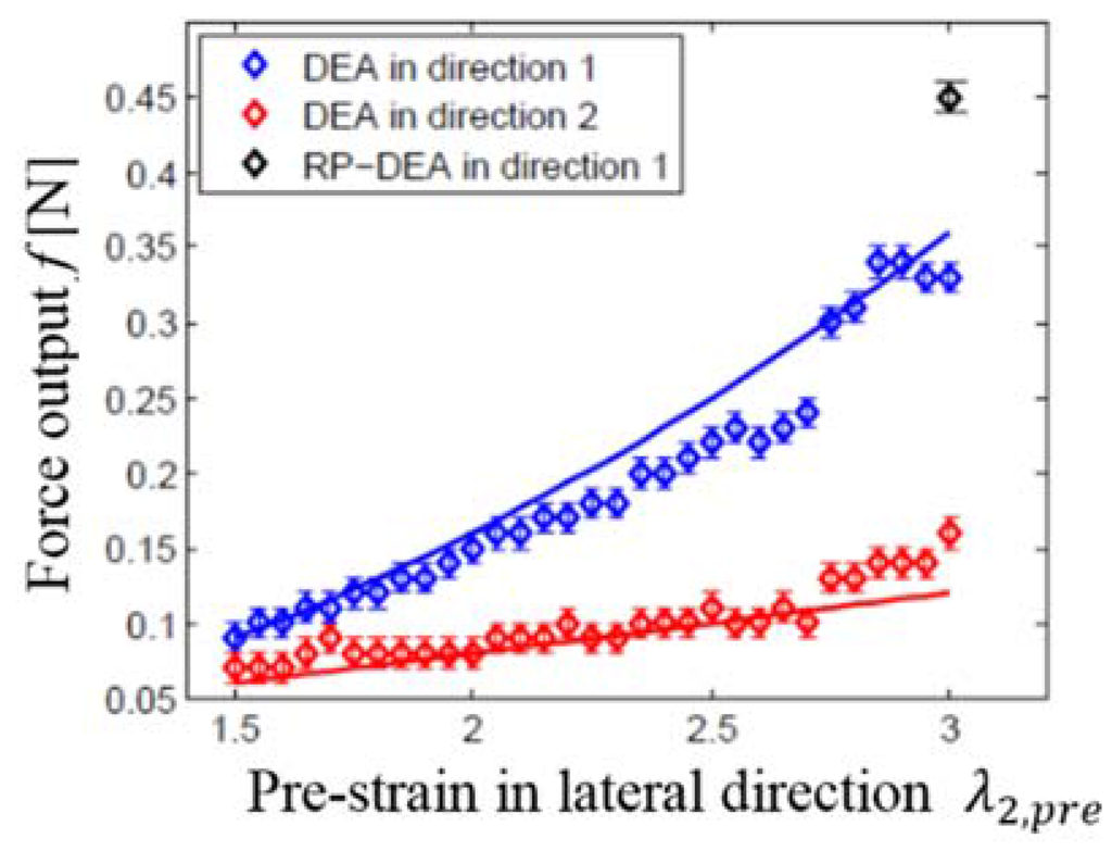 With the same pre-strains, and , the force output of the RP-DEA with the rod configuration was measured to be = 0.45 N (±0.01 N) in direction 1. It is a higher force output compared with that of the conventional DEA with the same pre-strain, 0.32 N (±0.01 N). The extra force output is due to the motion constraint, as the rods play the role of both maintaining pre-strain and constraining electrode movement in the RP-DEA.