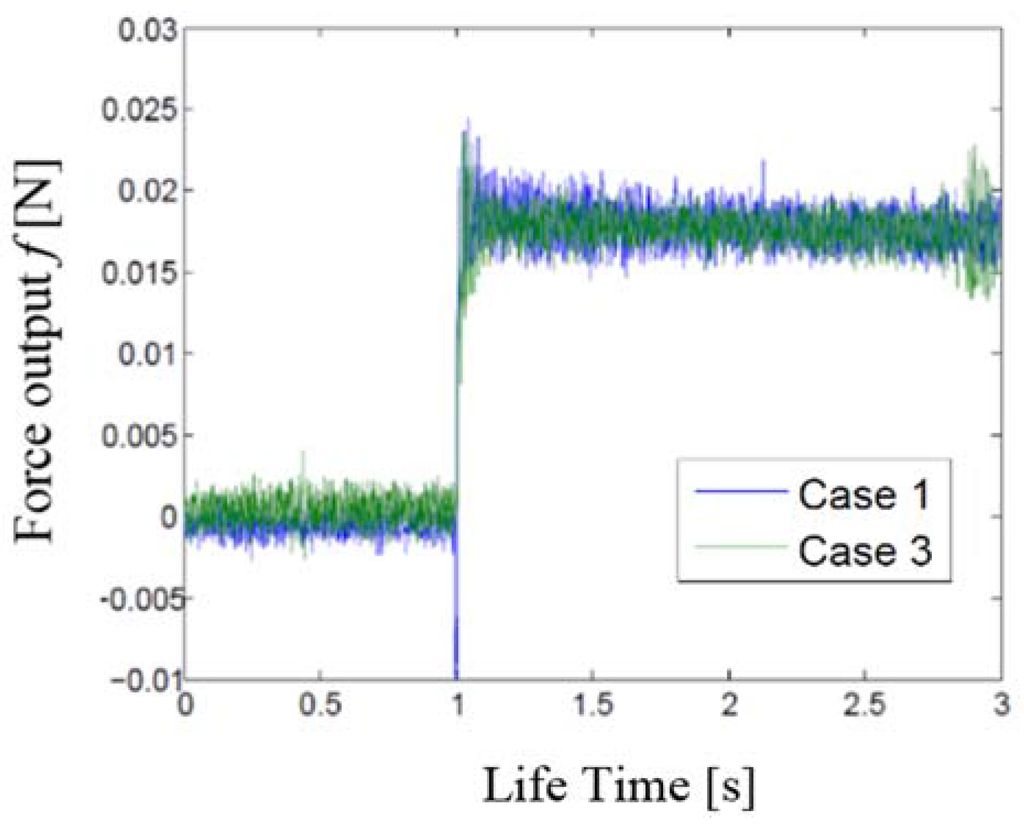 In the durability study of the RP-DEA, the static force responses of the structure as in Figure 1b were also measured to compare between Case 1 and Case 3. Five samples were measured for each case and the results are shown in Figure 7. The force output of the RP-DEA with multi-ARs was found to be 6% less than the force output of the RP-DEA with a single AR. The reason is due to the decrease in the total area of the AR. However, the reduction in force output is considered to be small compared with the 20% reduction in the area of the AR. The narrow gaps between ARs may also slow down the spreading of charge over the AR during the charging phase, hence lead to the change in the dynamics of the RP-DEA. It would require further study to fully identify this effect.