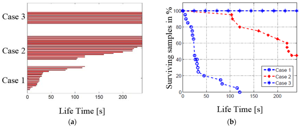 (a) Recorded lifetimes up to 240 s for RP-DEA with single AR (20 samples), with separate ARs (20 samples) and with separate ARs and off-AR contact (10 samples); and (b) accumulated surviving samples as a percentage.