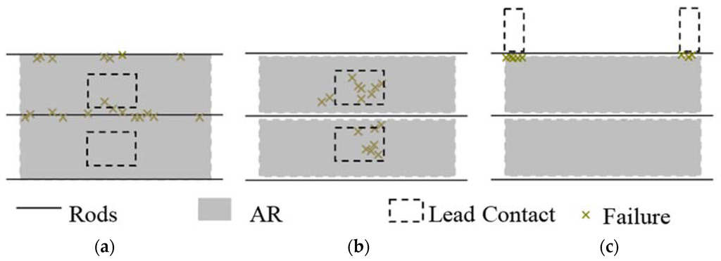 For life assessment, the sample size was scaled down with the total AR area of 20 mm × 20 mm as shown in Figure 1b,d. The RP-DEA had only three rods in order to simplify the fabrication process and yield more consistent samples. In addition, 3 AR configurations were used for the durability study. Figure 2a shows the conventional single AR configuration. Figure 2b shows multiple ARs with a gap of 1 mm from the rods. Figure 2a,b has the lead contact point inside the AR. Figure 2c is similar to Figure 2b, but with an additional inactive electrode.