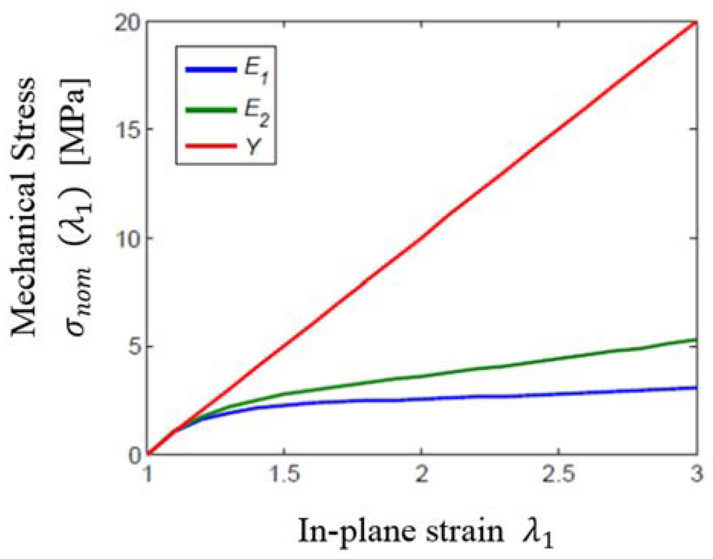 where is the Poisson ratio. Figure 10 presents the pre-inflection stress-strain correlation of the elastomer when subjected to large deformation, as appropriate to Equation (15). The elastomer becomes softer as it is stretched further in both directions. The relaxations in both elastic moduli are taken over the discrete steps in the simulation.