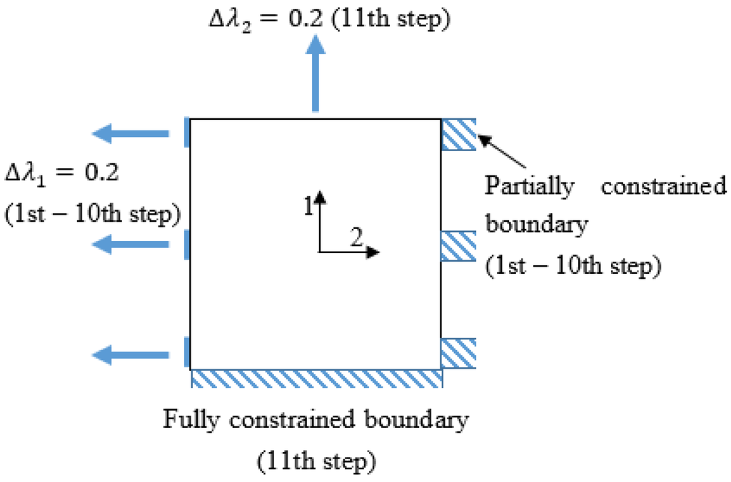 The applied boundary conditions were configured as shown in Figure 11. The simulated DE was set in a square, which corresponds to the AR as in Figure 2a. The sub-strain was applied on the three nodal sets in the left hand side edge of the square from the 1st to 10th steps of the simulation. The three corresponding nodal sets in the right hand side edge were fully constrained. This simulates the applied pre-strain that is held by the rod in direction 2, which was 200% in the experiment. The sub-strain was applied to the upper edge of the square, and the lower edge was fully constrained for the 11th step of the simulation. This simulates the 20% pre-strain from the experiment in direction 1.
