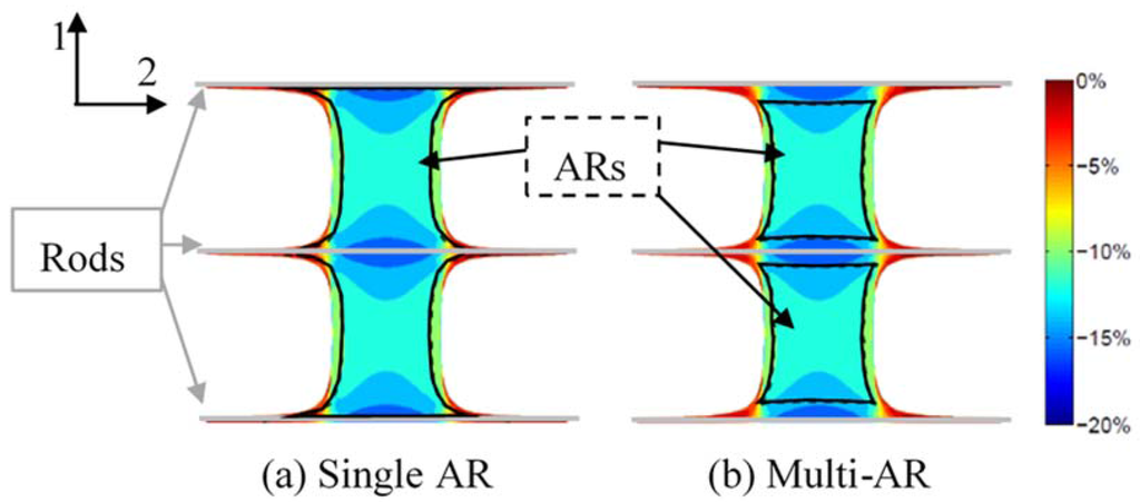 The simulated results for RP-DEA are presented in Figure 12. It shows the DE to be deformed non-uniformly in the RP-DEA. In general, the thickness of the film decreases as it moves from the edge to the center in direction 2. The three thinnest regions with are found around the rods, which correlate to the “weak” region that causes the premature failure shown in Figure 8. When the RP-DEA has the single AR as in Figure 12a, the AR covers all these thinnest regions. When the RP-DEA is configured with multi-ARs, the ARs only cover the relatively thin regions with . It hence avoids the resultant premature failure. In Figure 13, the AR of the RP-DEA, as in Figure 9a, were evenly divided into the left, center and right regions in direction 2. This evaluation suggests that in Case 1, 35% of the failures occurred in the left region; 50% of the failures occurred in the center; 15% of the failures occurred in the right region. It is in agreement with the simulation, where the “weak” regions around the rods cover a larger area in the center region compared with the side regions. More failures would therefore be expected to occur in the center region of the AR.