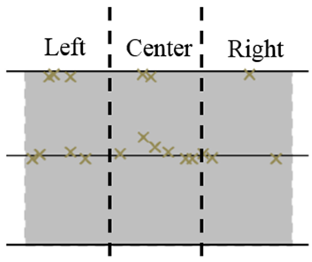 Occurrence of failures in Case 1 as: Seven in the left region; 10 in the center region and three in the right region of the AR (Figure 8a).