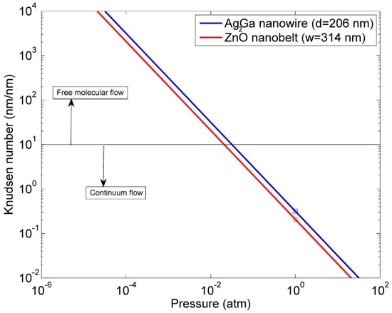 Bhiladvala et al. suggested two different mechanisms for the interaction between air molecules and nanoresonator depending on the diameter of nanoresonator and the air pressure [5]. As the cantilever diameter or width approaching sub-micron size, the size of beam itself is comparable to air molecules’ mean free path [5]. The Knudsen number (Kn) is the ratio of mean free path of air molecules to the lateral size of the resonator and it depends on the pressure of the air. Three different regimes based on the Knudsen number (Kn) were defined [5]. For Kn smaller than 0.01, continuum regime for air and fluid mechanics equations can be used. For Kn larger than 10, one can use the free molecular flow regime. A cross-over regime where 0.01 < Kn < 10 was also defined as transient between the continuum and molecular flow regimes [5]. Variations on the cross-flow regime has also been reported in the literature [31,32]. For Kn < 10, reports have also used simple continuum models even for the cross-flow regime [27,33,34].