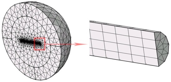 The model has a symmetry plane parallel to the lateral vibrations and resonator axis. For meshing, a triangular prism element for the resonator and tetrahedron for the surrounding medium have been considered. To have accurate results, the maximum size of the elements was determined as 20% of the wavelength. It should be mentioned that there is a boundary viscous and thermal thin layer around the resonator; the gradients of velocity and temperature are large, and the mesh size in this region should be smaller than the thickness of the acoustic boundary layer [49]. Figure 3 presents the meshed model in COMSOL. Frequency domain analysis was used to develop a frequency response function (FRF) for the nanoresonator. Clamp-free was considered as the boundary conditions of the beam, and base motion vibration with ~500 nm amplitude was applied as a mechanical input. The vibration amplitude at the free end is plotted for different frequencies and the width of the half power point of experimental and simulated graphs is calculated as the Q factor.