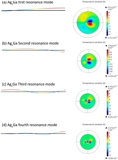 Mode shape and temperature variation for different modes of AgGa nanoneedle.