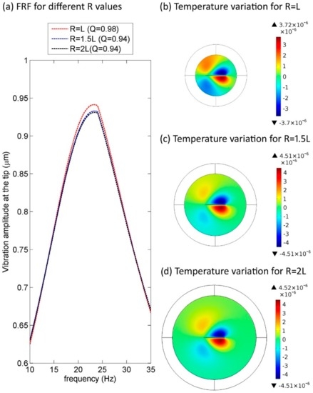 Figure 5 shows the mode shapes and temperature variation for the first four modes of the Ag2Ga nanoneedle. As is shown, the radius of the thermal boundary layer decreases as the frequency increases. For example, the diameter of temperature variation for the fourth mode is in the same scale of the nanoresonator length, but for the first mode, the diameter of temperature variation is almost twice the length of the nanoresonator. Based on the acoustic effects of MEMS resonators that led to improved performance [50], we used a similar concept to define the radius of the thermoacoustic sphere. A smaller thermoacoustic sphere can be used for high frequency modes to make the computations faster and less expensive. In these simulations, the radius of the thermoacoustic sphere (R) for the first mode is 50% larger than the resonator’s length (L), but in higher modes, the radius of the thermoacoustic model and the length of the nanoresonator are equal. Figure 6 compares the results of the thermoacoustic model for the first resonance mode with different thermoacoustic sphere size. The results are different when R = L, R = 1.5 L. However, there are no differences between the results of simulations when R = 1.5 L and R = 2 L. Therefore, if the sphere is large enough that the temperature variation at outer regions of sphere is zero, the size of sphere is optimum and making the sphere bigger will not affect the results. Based on these observations for the final results, R = 1.5 L was selected for the first mode but for modes 2, 3, and 4, R = L was selected as the size of sphere.