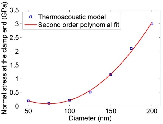 Effect of diameter on the normal stress at the clamp end of nanowire. Theoretical model suggested a linear fit while the thermoacoustic model shows a second-order polynomial fit for the relationship of diameter and normal stress at the clamp end.