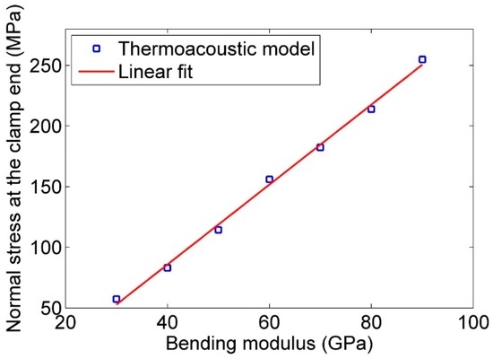 Effect of bending modulus on the normal stress at the clamp end of a nanowire. The analytical model corresponds to the results of the thermoacoustic model ().