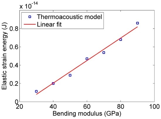 Effect of bending modulus on the elastic strain energy of nanowire. The analytical model matches with the results of a thermoacoustic model ().