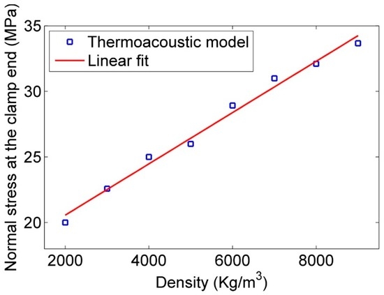 Figure 7, Figure 8, Figure 9, Figure 10, Figure 11, Figure 12, Figure 13 and Figure 14 show the effect of diameter, length, bending modulus, and density on the maximum stress at the clamp end and elastic stored energy of nanowire in an ambient condition for each mode. In each figure, the fitted curve on the thermoacoustic results is shown. Except for the relationship between the diameter and normal stress, the simulated results corroborate the findings of the analytical model.