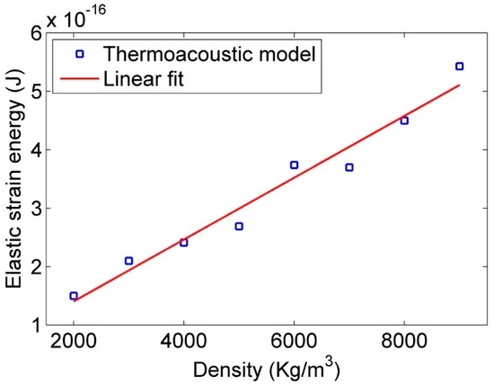 Figure 7 and Figure 8 show the effect of diameter on the normal stress at the clamp end and strain energy of the nanoresonator. In these simulations, 10 µm as length, 90 GPa as bending modulus, and 9000 kg/m3 as the density of the nanoresonator were kept constant, and the results are plotted for different diameters. While the analytical model (Equation (11)) suggests linear behavior between the diameter and normal stress, the simulation results show a second-order polynomial fit. As the diameter of the nanoresonator decreases, it gets closer to the free molecular regime and the thermoacoustic model fails to simulate the vibration of nanoresonator in this regime accurately. However, Figure 8 shows a fourth-order polynomial fit for strain energy which is consistent with what is suggested in Equation (12).