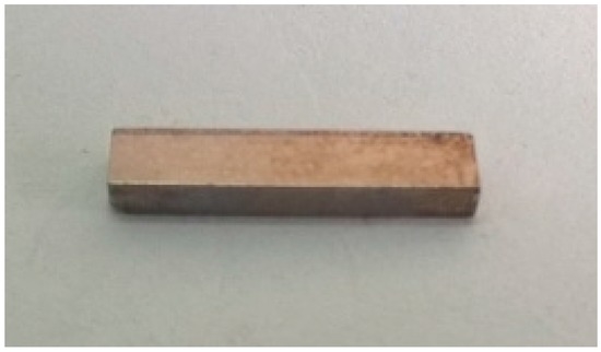 The sample of MSMA in the experiment is an NiMnGa alloy purchased from the Goodfellow company (Huntingdon, UK). The overall dimensions of the sample are , and its appearance is shown in Figure 1. Moreover, the atomic percentages of the Ni element, Mn element, and Ga element are 50%, 28%, and 22%, respectively.