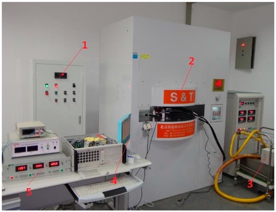 Experimental setup: (1) power; (2) loading device; (3) power supply for temperature loading system; (4) computer with data acquisition card, which collects input magnetic field intensity H and output magnetic induction intensity B; and (5) control device for magnetic field.