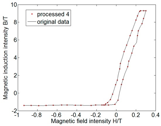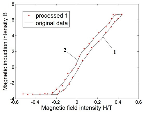 Through the original experimental data curve in Figure 3, magnetic induction intensity B is maintained at approximately −3.4 T when magnetic field intensity H ranges from −0.25 T to −0.54 T. Shown as curve 1 in Figure 3, magnetic induction intensity B gradually increases from −3.4 T to 6.8 T when magnetic field intensity H ranges from −0.25 T to 0.4 T. However, shown as curve 2 in Figure 3, magnetic induction intensity B gradually decreases from 6.8 T to −3.4 T when magnetic field intensity H ranges from 0.4 T to −2.5 T. Obviously, curve 1 and curve 2 do not coincide. Therefore, as shown in Figure 3, the relation curve between magnetic field intensity H and magnetic induction intensity B is the hysteresis curve of the MSMA.