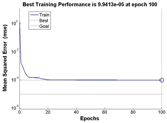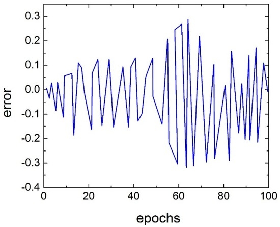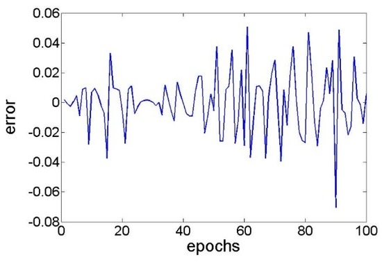 To further analyse the fitting effect using an original BP artificial neural network, the mean square error is introduced. As shown in Figure 8, the mean square error sharply decreases during 0–10 iterations. After 10 iterations, the mean square error slows until it stops changing. Finally, the mean square error reaches its minimum of at the 100th iteration. Therefore, compared with the least squares method, the BP artificial neural network based on a genetic algorithm can decrease the fitting error and improve the accuracy of the MSMA actuator. In addition, its convergence rate is relatively slow.
