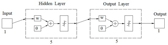 In Equation (3), a and b are, respectively, the number of input layer nodes and output layer nodes. In addition, c ranges from 1 to 10. When c is 3, the number of hidden layer nodes is 5. Therefore, the structure of the artificial neural network is 1-5-1, as shown in Figure 5.
