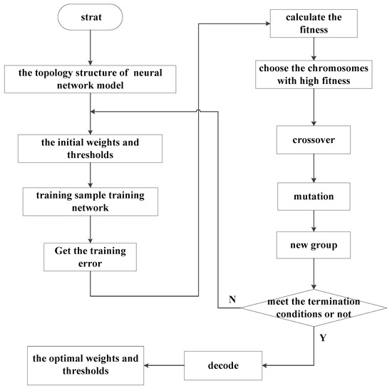 In order to accelerate the convergence rate of the original BP artificial neural network, this paper uses a genetic algorithm to improve BP artificial neural network. As shown in Figure 9, the weight and threshold values of the BP artificial neural network are optimized through selection, crossover, and mutation of the genetic algorithm.