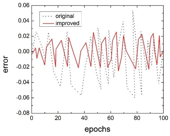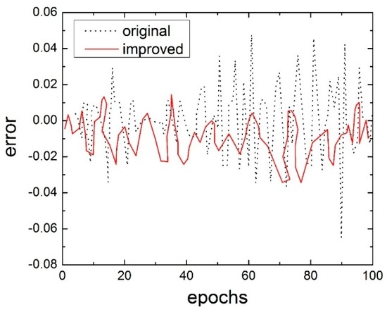 Fitting-error-rate curve. “Original” and “improved” represent the fitting-error-rate curve of the BP artificial neural network and BP artificial neural network based on genetic algorithms, respectively.