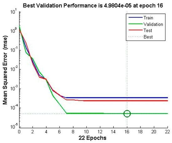 To further show the advantages of the BP artificial neural network based on a genetic algorithm, as shown in Figure 11, the mean square error of the BP artificial neural network based on a genetic algorithm reaches its minimum of at the 16th iteration. Compared with the mean-square-error curve of the original BP artificial neural network in Figure 8, a BP artificial neural network based on a genetic algorithm not only accelerates the convergence rate but also decreases the fitting error.