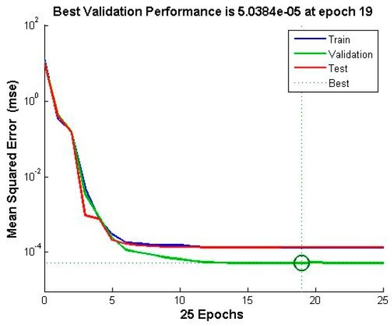To further show the advantage of the BP artificial neural network based on a genetic algorithm, as shown in Figure 14, the mean square error of the BP artificial neural network based on a genetic algorithm reaches its minimum of 5.0384 × 10−5 at the 19th iteration. There is no doubt that a BP artificial neural network based on a genetic algorithm can accelerate the convergence rate and decrease the fitting error.