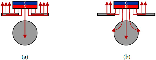 In the flux-path control magnetic suspension system, the attractive force of the permanent magnet is controlled by varying the amount of flux that reaches the suspended object (floator). Figure 1a shows a schematic illustration of the flux-path control magnetic suspension using flux-path interrupted plates. In this system, a pair of control plates is inserted between the permanent magnet and the floator. As the distance between the control plates becomes wider, the amount of the flux reaching the floator increases and the attractive force acting on the floator becomes larger. In contrast, as the distance between the control plates becomes narrower, the attractive force becomes smaller. Based on this principle, the attractive force is controlled by adjusting the distance between the control plates.