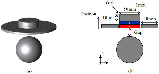 The flux-path control magnetic suspension using control plates is compared with a conventional magnetic suspension using DC electromagnet. The proposed system is the same as the system treated in Section 3.1. The conventional system using an electromagnet is composed of the cylindrical magnetic source with ferromagnetic yoke, a coil, and the spherical floator (Figure A1). The number of turns of the coil is assumed to be 500. The coil is placed to align its center axis with that of the cylinder-shape permanent magnet. The gap is fixed to be 20 mm. The control plate is placed at the lowest position and moved upward to the position of 10 mm. The attractive force at each position is shown in Figure A2a (Figure 6). The attractive force varies from 8 N to 15 N. Then, the current-force characteristics of the suspension system (b) are analyzed. The result is shown in Figure A2b. In order to obtain the same variation of the attractive force (7 N), it is necessary to vary the current more than 7 A, that is, the necessary magnetomotive force is 3500 AT, which is rather large. This result suggests that the flux-path control magnetic suspension using the control plates is suitable for wide-gap suspension with low-energy consumption.