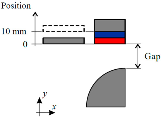 The gap is defined as the distance between the bottom of the permanent magnet and the top of the floator. The control plate is placed at the position of 0 mm (the lowest position) or 10 mm. Figure 4 illustrates each position of the control plate. Figure 5 shows the gap-force characteristics obtained via numerical analysis. Compared to the attractive force without the control plate, the attractive force is smaller when the control plate is at the lowest position, and is larger at the position of 10 mm.