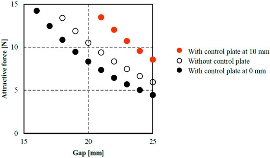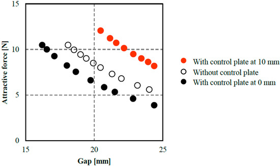 The gap-force characteristics are measured when the control plate is placed at the lowest position and the position of 10 mm. The result is shown in Figure 12. When the control plate is placed at the lowest position, the attractive force is smaller than that without the control plate. When the control plate is placed at the 10 mm position, the attractive force is larger than that without the control plate.