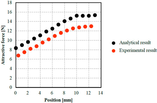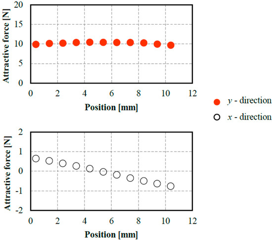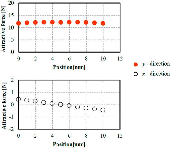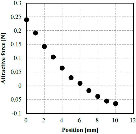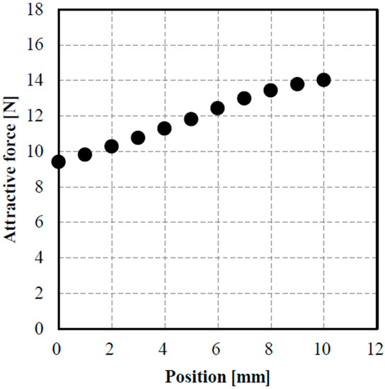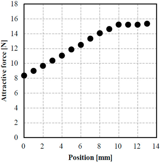 Then, the gap is fixed to be 20 mm. The control plate is placed at the lowest position and moves upward to the position of 10 mm. The attractive force at each position is shown in Figure 6. The variation of the attractive force is 0.7 N/mm. In addition, the attractive force is saturated when the position is higher than 10 mm.