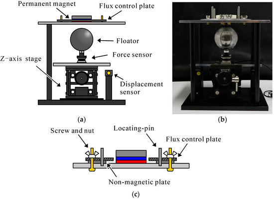 An experimental apparatus was fabricated to measure the attractive forces under the same conditions assumed in the analysis. Figure 11 shows schematic illustrations and a photograph of the experimental apparatus. An annular control plate is placed to align its center axis with that of a cylinder-shape permanent magnet. The height of the plate is adjusted by inserting a non-magnetic plate whose thickness is known. The lateral position of the plate is adjusted by locating-pins and screws as shown by Figure 11c. The position of a floator is detected by an eddy-current displacement sensor. The attractive forces are measured using a 3-axis force sensor on which the floator is fixed. The floator is made of SUJ-2 with a diameter of 63.5 mm and a mass of 1 kg. The permanent magnet is made of neodymium with a surface magnetic flux density of 380 mT, a diameter of 50 mm, and a thickness of 10 mm.