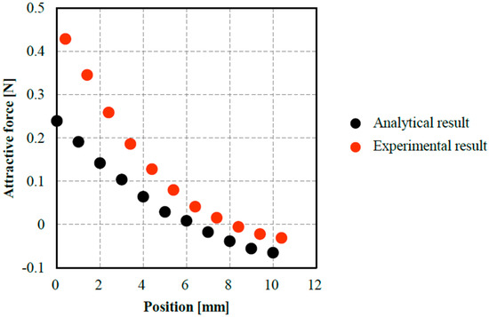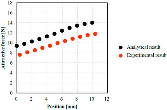 Then, the gap between the permanent magnet and the floator is fixed to 20 mm. The control plate is placed at the lowest position and moved upward. The force at each position is shown in Figure 13. The variation of the attractive force is 0.7 N/mm. In addition, the attractive force is saturated when the position is higher than 10 mm. These experimental results have the same tendency as the analytical results. However, the attractive force predicted by the FEM analysis is larger than the measured force. One of the reasons is that the target system has a rather large leakage flux. In addition, the parameters such as the permeance of iron are set to be nominal in the FEM analysis and are not measured. These parameters may have caused the differences.