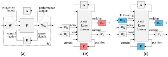 (a) Generalized μ-synthesis framework; (b) μ-synthesis framework for basic AMB controller design, and; (c) μ-synthesis framework for robust levitation recovery AMB controller design.